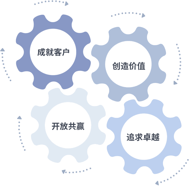 成就客户是一切决策的出发点,,创造价值是衡量所有工作的标准,,,追求卓越是我们做事做人的态度,,开放共赢是我们的格局也是最终的结果。。。价值观的齿轮环环相扣,,推动着组织里的每个人不断向前。。。。