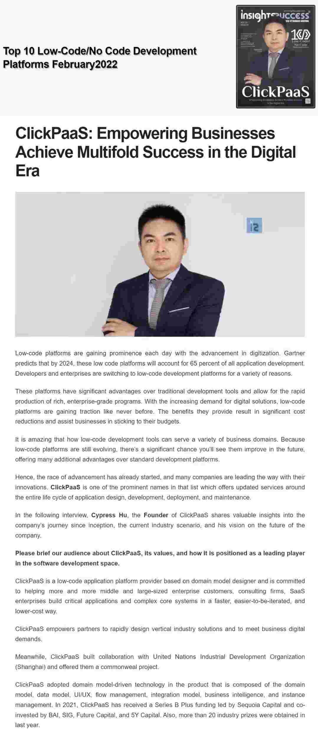 2022年年初,,,,,,,,,,NO钱包入选外媒Insights Success低代码/无代码开发平台 Top10,,,,,,创始人、、、、、、、、、、CEO胡柏受邀接受专访并荣登封面人物,,,,,,,他与Insights Success的读者分享了NO钱包成立的初心、、、、、、、、发展历程、、、、、当前的行业发展趋势以及他对公司未来的展望。。。。。。。。。