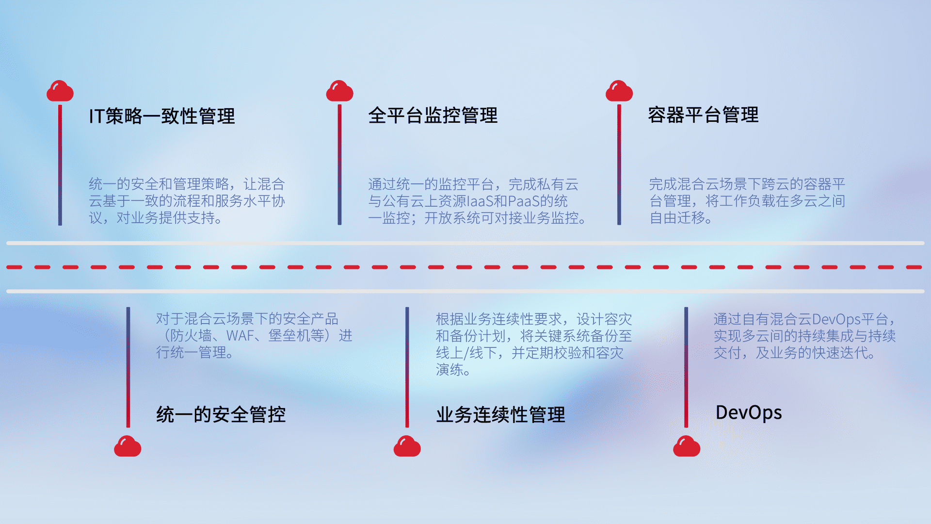 通过多云纳管,,以统一的资源数据模型把客户的云资源进行抽象和封装,,,进而实现对多云资源的统一操作,,,,保障云资源管理的可靠性、、、、稳定性与可用性。。量身定制化运维内容,,配置、、开发运维、、补丁管理、、备份、、、、监控、、认证和访问管理、、、、审计和日常巡检等,,保障在用云过程中的可靠度,,,,稳定度以及高可用率。。。